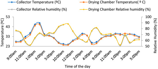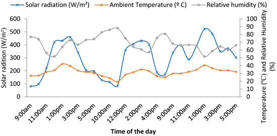 The solar dryer was tested under the worst-case environmental conditions of the rainy season (2–4 September 2021). Though this time is the peak of the harvesting season for tuber crops in this area, it is characterized by high humidity and low solar radiation, as presented in Figure 2. Open sun drying is so difficult during this time and a little temperature gain above the ambient means a lot to farmers in drying their crops. The goal of evaluating the solar dryer during this period is to have the minimum performance of the solar dryer which will improve during the dry season or harmattan period with lower humidity and higher solar radiation. During the test period, the maximum solar radiation was 521.7 W/m2 with an average value of 303.6 W/m2. The average value of solar radiation obtained is lower than the 368.38 W/m2/day reported by Ndukwu et al. [18] for this area. Higher solar radiation occurred from 11.00 a.m. to 3.00 p.m. local time while 9.00 a.m. to 11.00 a.m. had lower solar radiation. Low solar radiation can be used as a warm-up period as no meaningful drying can be achieved during this period [35]. Figure 2 shows that higher solar radiation is synonymous with higher temperature and lower relative humidity. However, the temperature of the area ranged from 19.4 to 42.1 °C and the relative humidity ranged from 51.6 to 88.1%. During these drying periods, the average collector and drying chamber temperatures were 33.41 and 32.53, while the relative humidity was 66.92% and 67.5% respectively. The highest temperature difference between the ambient and the collector was 7 °C, while it was 5.5 °C for the drying chamber. However, the minimum relative humidity for the collector and the drying chamber was 50.6% and 52.3%, respectively.