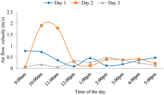 The determined variation of the air velocity for the solar dryer for the three-day drying periods is shown in Figure 3. The air velocity varied between 0.063 and 1.9 m/s with an average value of 0.42 m/s for the three days. It was observed that the airflow velocity affected the relative humidity of the collector and the drying chamber. Comparing Figure 3 and Figure 4 shows that the relative humidity of the collector and drying chamber decreased as the airflow velocity decreased, and also increased with the airflow velocity. The reason for this might be that, at high airflow velocity, greater airflow volume with higher moisture will be available per time compared to lower airflow velocity. However, due to the partitioning, this air is delayed a little bit to receive more heat, which leads to an increase in temperature observed at a high relative humidity on the first day between 12.00 p.m. and 2.00 p.m. local time. This period can be regarded as a warm up period for the solar dryer as it was not observed again.