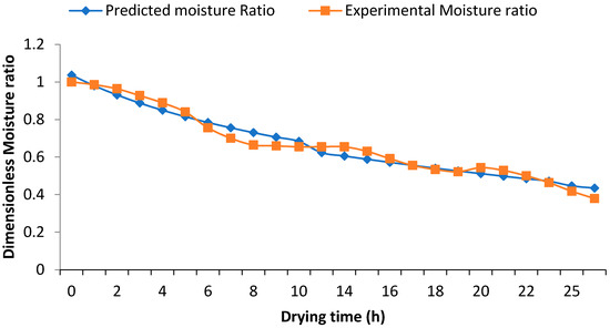The evolution of moisture ratio and the drying rate of the cocoyam chips are shown in Figure 5 and Figure 6. Although, the moisture ratio decreased continuously and followed the falling curve behaviour, the drying rate showed sinusoidal characteristics, which depict the non-isothermal characteristics of solar dryers [36]. The reason for this is that the temperature and humidity evolution which drives the drying process is subjected to the vagaries of weather conditions that are not static. The downward nature of the sinusoidal curve of the drying rate still showed that the diffusion mechanism dominates the moisture transfer mechanism. This is similar to the results obtained by Hawa et al. [29] for untreated Cabaya fruits. The drying rate was highest at the first 6 h of drying but decreased afterwards. This is because the rate of mass transfer is higher due to greater moisture availability, but as the drying progresses, more energy is required to break the moisture bond due to the increased internal mass resistance of the material [37]. The moisture ratios were obtained by converting the moisture content into dimensionless form. To predict the moisture behaviour, the moisture ratio was fitted into seven semi-theoretical and empirical models to select the best-fitted model to predict it, and the results are presented in Table 7. Table 6 also shows the values of the model constants, R2, χ2, and RMSE values for each model. The goodness of fit between the experimental and predicted moisture ratio was verified by a higher R2 value and lower chi-square and RMSE [38]. However, as shown in Table 6, for all the models used, R2, χ2, and RMSE values ranged from 0.95421 to 0.9666, 0.001165 to 0.00191, and 0.02923 to 0.03891, respectively, with the two-term model having the best fit. The plot of the predicted moisture ratio with the two-term model and the experimental moisture ratio is shown in Figure 5.