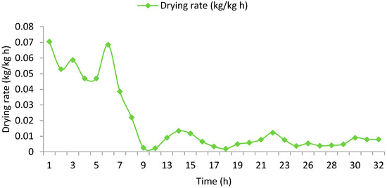 The hourly solar drying, which is the hourly mass of moisture evaporated from the cocoyam, was determined with Equation (3) [27].