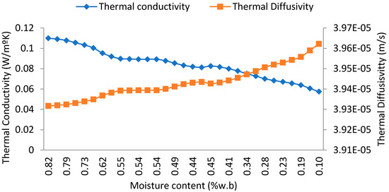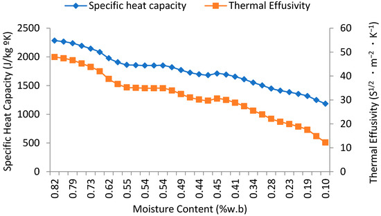 Figure 7 and Figure 8 show the relationships between the specific heat capacity (Cp), thermal conductivity (K), thermal diffusivity (), and thermal effusivity () with moisture loss. The specific heat capacity and thermal conductivity were determined as a function of the moisture content. In contrast, the thermal diffusivity and effusivity were deduced as a function of the thermal conductivity and specific heat capacity. Loss of moisture resulted in the decline of the specific heat capacity, thermal conductivity, and thermal effusivity, while the thermal diffusivity increased, as shown in Figure 7 and Figure 8 below.