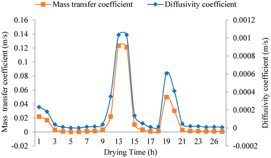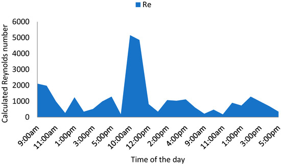 The plot of the Reynolds number in Figure 9 shows that it varies from 171.7 to 5152.669, which indicates that the airflow condition gravitates between laminar and turbulent flow due to the effect of partitioning and the wind air generator. This is a result of inconsistency in wind speed as they vary due to the vagaries of weather changes. A lower Reynolds number indicates the dominance of vicious force at that moment while a higher Reynolds number is an indication of inertia force domination due to the increased speed of the flow. The non-linear relationship between the Reynolds number and the airflow velocity is presented in Equation (23). The values of the Reynolds number affect the mass and diffusivity transfer coefficient and are linearly related. For this research, the variation of the heat transfer, mass transfer, and diffusivity coefficient was computed with the Schmidt and Reynolds numbers. Additionally, the mass transfer coefficient and the Lewis number were used to compute the heat transfer coefficient for the drying of the cocoyam. Therefore, the results also mimicked the sinusoidal characteristics of the plot of the Reynolds number as shown in Figure 10 and Figure 11. However their values varied from 7.1 × 10−5 to 1.2 × 10−1 m/s for mass transfer coefficient, 1.05 × 10−6 to 1.035 × 10−3 m/s for diffusivity coefficient, and 3.056 to 5.771 W/m °C for heat transfer coefficients with average values of 1.757 × 10−2 m/s, 1.79 × 10−4 m/s, and 3.85 W/m °C, respectively.