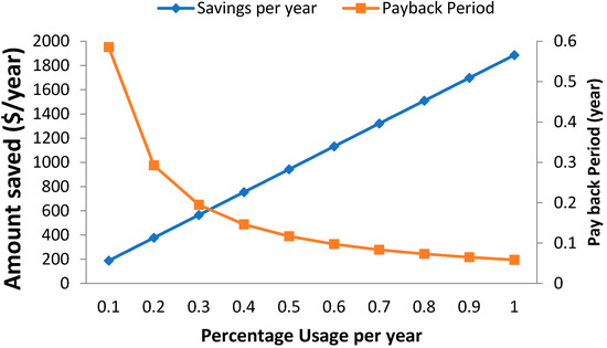 Solar drying has the advantage of cost-saving over most other dryers. The cost analysis is based on the prevailing economic conditions and monetary policy of Nigeria. For ease of the analysis, it was assumed that the solar dryers operate for 20 days monthly excluding the official weekends (Saturday, Sunday, and half a day on Fridays). However, it is also assumed that the rate of usage might vary depending on the availability of sunshine hours, which vary between 3.5 and 9 h in Nigeria [42,43]. Therefore, the percentage usage graduated from 10% to 100%. The initial cost of fabricating the dryer is presented in Table 2 with a total cost of $122.714. Considering the energy consumption presented in Table 5 and the unit cost of electricity in Nigeria, the amount of saving per rate of usage is presented in Figure 12. The computed values increased from $188.63 to $1886.13. This amount of savings is huge for a poor country like Nigeria where a lot of people are still living below the poverty line. The amount saved was used to compute the payback periods based on the percentage usage. The payback period ranged from 0.059 to 0.59 years (21.54–215.35 days). This is far lower than the payback period for tunnel dryers calculated as 13 years [44]. Therefore, assuming a life span of 10 years, the dryer will run almost cost-free throughout its entire life.