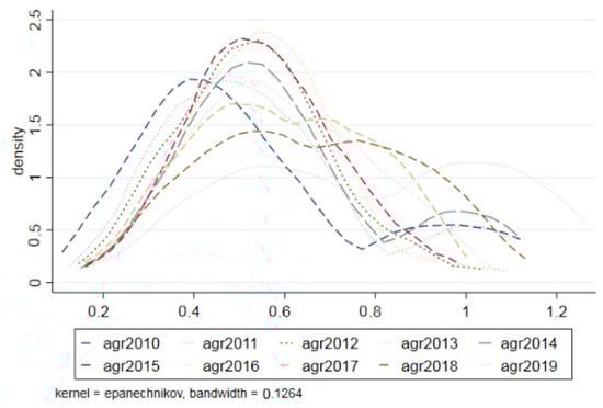 The above analysis shows the time series changes and average development trend of agricultural production efficiency. This paper used kernel density estimation to analyze the dynamic evolution process of agricultural production efficiency in China. Figure 1 shows the distribution of kernel density estimates of agricultural productivity from 2010 to 2019.