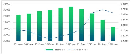 According to the estimation method of agricultural carbon emissions and the carbon emission coefficients of different carbon sources given above, this paper obtained the carbon emissions of other regions in China from 2020 to 2019. According to the estimated results, the total value of agricultural carbon emissions in China from 2010 to 2019 and the regional Theil index are drawn, as shown in Figure 2.