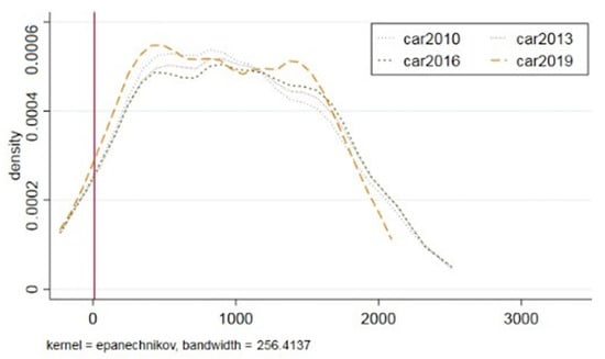 In order to investigate the dynamic evolution of agricultural carbon emissions in China, this paper next uses kernel density estimation to analyze it. Due to the slight differences in the kernel density estimates of different farm carbon emissions, Figure 3 only shows the distribution of the kernel density estimates of agricultural carbon emissions in 2010, 2013, 2016, and 2019 in China.