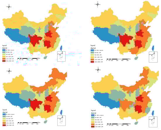 The variation trends and spatial distribution characteristics of carbon emissions in different regions are shown in Figure 4. Figure 4 shows the distribution map of agricultural carbon emissions in China based on agricultural carbon emissions by region in 2010, 2013, 2016, and 2019. The figure divides regional carbon emissions into five groups, namely 50-5 million tons, 501-8 million tons, 801-13 million tons, 1301-18 million tons, and 1801-25 million tons. Then draw a map of the regional distribution of different groups.
