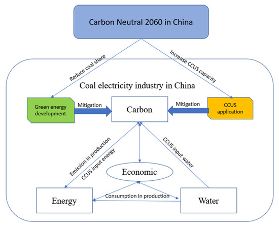 In the 2020 United Nations General Assembly, President Xi Jinping declared that China would aim to cut peak emissions before 2030 and pledged to achieve carbon neutrality before 2060 [16]. To accomplish carbon neutrality, the energy sector, especially coal power generation, should be the first emission source that needs urgent action. Generally, two pathways of action can reduce carbon emissions in power generation in countries where coal is the primary power source. The first is to reduce the share of coal power in the country’s total power supply, and the second is to reduce carbon emissions from coal power generation by applying the technology for carbon capture, utilization, and storage (CCUS).