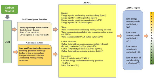 The ATPCC is a policy-driven, carbon–energy coupling effective tool, allowing users to apply it to any governance level or geographic area with the coal industry and under different carbon-neutral requirements. The user input portfolios comprise two major sub-scenarios: the total electricity generated from the coal industry and the total carbon captured by CCUS in the coal industry. There is also a customized option for users to provide specific parameters for electricity generation and cooling in the power plant, or users can directly replace parameters and their trends in ATPCC based on their status quo.