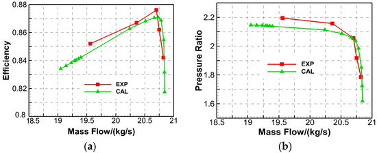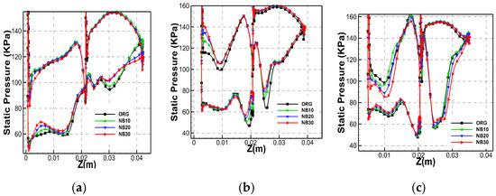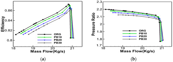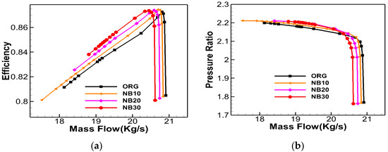Figure 7 shows the comparison of isentropic efficiency and total pressure ratio characteristics of NB10, NB20, and NB30, and