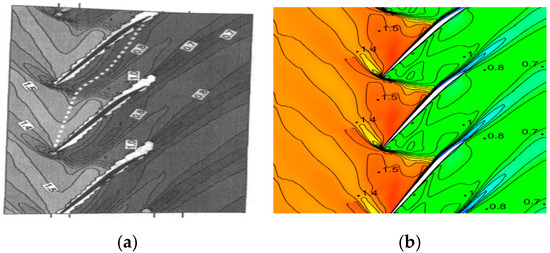 Figure 22 shows the comparison of the entropy diagram of the casing wall of PB10, PB20, and PB30. The positive bow blade reduces the total pressure loss in the tip region. It can be seen from the previous analysis that this is because the positive bow blade promotes the movement of the low-energy fluid in the blade tip region to the low blade span, which increases the flow capacity of the blade tip channel and changes the shock wave structure in the blade tip region. The intensity of the shock wave and the range of the low-energy high-entropy fluid after the shock wave is also reduced.