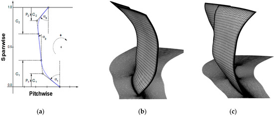 Figure 6 shows the design method of the bow blade and the computational meshes of the two types of bow tandem blades. As shown in