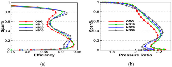 Figure 8 shows the comparison of the spanwise distribution of the total pressure ratio and the efficiency of NB10, NB20, and NB30. Compared with ORG, negative bow blades significantly increase the efficiency and total pressure ratio of the rotor from a 20% span to a 85% span. With the increase of the bow angle, the increase in efficiency and total pressure ratio from a 20% to a 85% span is more significant. In addition, negative bow rotors deteriorate the flow field structure in the blade tip region, and at the same time, negative bow rotors also increase the total pressure loss of the hub end wall. With the increase of the bow angle, the total pressure loss in the blade tip region and the hub region gradually increases, and the decrease degree in the total pressure ratio also increases gradually.