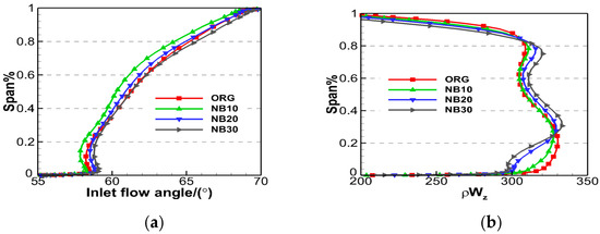 Figure 9 shows the comparison of spanwise distribution of the inlet flow angle and the axial velocity density (AVD) of NB10, NB20, and NB30. Compared with ORG, the inlet flow angle of the tandem rotor with NB10 is reduced about 1° across the full span, and the flow moves along the direction of the negative incidence angle, resulting in a decrease of blade aerodynamic load across the full span. However, the total pressure at the rotor outlet increases because the efficiency of the middle region of the tandem rotor is improved. The tandem rotor with 20°and 30° negative bow increases the inlet flow angle in the hub region, resulting in an increment of blade aerodynamic load in this region. In addition, the inlet flow angle in the middle span is reduced by the tandem rotor with NB20, whereas the inlet flow angle in the middle span is basically unchanged by the tandem rotor with NB30. It can be seen from the AVD comparison diagram that the AVD in the hub and case is reduced by the three negative bow tandem rotors, whereas the AVD in middle span is increased. This is because the three negative bow tandem rotors migrate the low-energy fluid in middle span to the hub and case region, increase the amount of low-energy fluid in the hub and case region, and improve the flow field in the middle span.