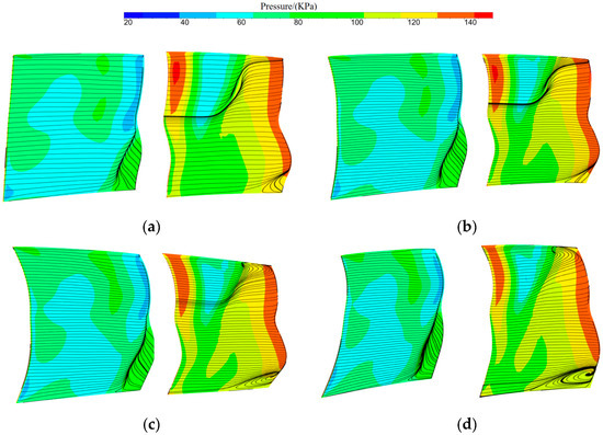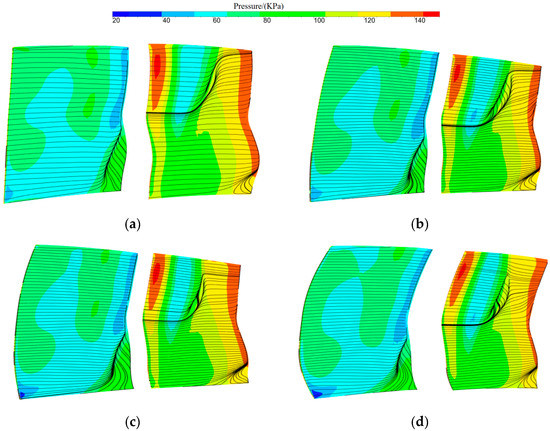 Figure 20) gradually moves away from the leading edge of the blade to the middle blade passage. The intersection of the suction surface branch of the hoof vortex and the suction surface of the blade moves towards the leading edge of the blade. The intersection of the pressure surface branch of the horseshoe vortex and the suction surface of the blade also gradually moves towards the leading edge of the blade. This is because the positive bow blade improves the flow field in the hub region, the diffusing capacity of the hub region is increased, and the lateral and flow pressure gradients are significantly increased, which results in the saddle point of the horseshoe vortex separation at the leading edge of the blade to move to the middle of the blade channel. At the same time, under the action of the large adverse pressure gradient, the pressure surface branch of the horseshoe vortex and the blade suction surface intersect earlier. It can be seen from the limiting streamline diagram of the suction surface that the lateral flow of the end wall is enhanced, and the flow field in the hub region is improved, but the separation range of the low-span boundary layer of the front rotor is slightly increased.
