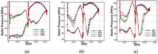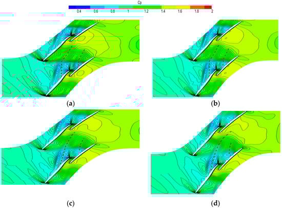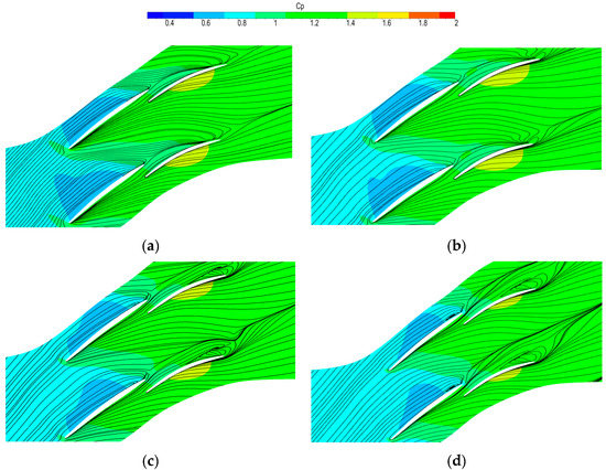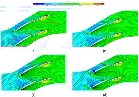 Figure 20 shows the comparison of flow line and the static pressure diagram on the hub end wall of PB10, PB20, and PB30. It can be seen that the positive bow blade improves the flow field in the hub region. With the increase of positive bow angle, the saddle point of the horseshoe vortex at the leading edge (the red circle point in