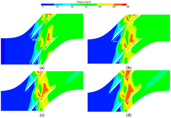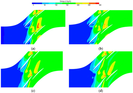 Figure 14 shows the comparison of the entropy diagram of the casing wall of NB10, NB20, and NB30. It can be seen that the negative bow blade worsens the flow field in the tip region and increases the total pressure loss in the tip region. As can be seen from the above analysis, this is because the negative bow blade pushes the low-energy fluid into in the tip region, which intensifies the blockage of the tip region passage and makes the shock wave in the tip region move towards the leading edge of blade. Therefore, the intensity of shock wave, the boundary layer separation, and the intensity of the tip leakage flow is increased.