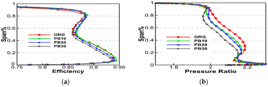 Table 4, we can see that the positive bow blades decrease the maximum efficiency and worsen the flow field of the tandem rotor, which reduces the back pressure corresponding to the maximum efficiency point of the rotor. Therefore, the distribution of the total pressure ratio decreases significantly along the spanwise direction. In general, although the positive bow blade increases the efficiency of the end-wall region of the hub and casing, the overall performance of the tandem rotor is reduced because the flow field of the rotor with 10–50% blade span is deteriorated at the same time. This is consistent with the action mechanism of the positive bow blade on the flow field of the transonic single rotor.
