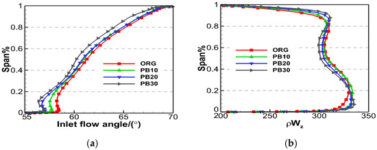 Figure 17 shows the comparison of spanwise distribution of the inlet flow angle and the axial velocity density (AVD) of PB10, PB20, and PB30. Compared with ORG, the positive bow blade reduces the inlet flow angle of the whole span of the tandem rotor, which makes the flow move along the direction of the negative incidence angle. In addition, the AVD in the hub and the casing region is increased and the low-energy fluid in the hub and the casing region is reduced by the three positive bow blades. At the same time, the positive bow blade also reduces the AVD in most spans of the tandem blades, and reduces the diffuser capacity of the corresponding span.
