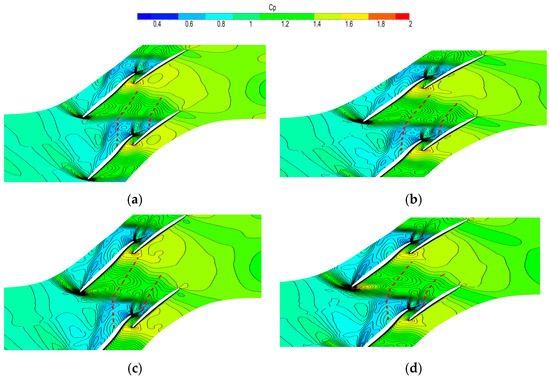 Figure 21 shows the comparison of the static pressure coefficient diagram near the casing end wall of PB10, PB20, and PB30. This paper uses the static pressure contour line inclined groove connection near the casing end wall to approximate the blade. The trajectory of the tip leakage vortex is shown as the red dotted line in the figure. In this paper, the static pressure isoline inclined groove connection near the end wall of the casing is used to approximate the trajectory of the tip leakage vortex, as shown by the red dotted line in the figure. It can be seen that the positive bow blade does not significantly change the starting position of the tip leakage flow of the front and rear blades, but slightly increases the circumferential deflection of the tip leakage flow trajectory and increases the strength of the tip leakage flow.