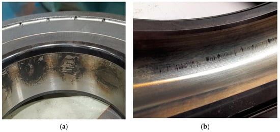 Irregular pitting of the bearing caused by the flow of bearing currents on the inner surface of the bearing (a) and the inner surface of the outer race of the bearing (b).