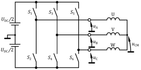 The common-mode voltage has the form of a step function of time with a maximum value equal to half of DC-link voltage UDC. The value of the voltage change on individual steps is 1/3 UDC; this is alternating voltage, with a frequency dependent on the switching frequency. The use of switches with short switching times (e.g., IGBT transistors) results in voltage rise rates in the inverter output voltages and the common-mode voltage, up to 10 kV/μs [11], especially in the case of using converters based on the SiC technology [12].