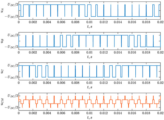 The basic control algorithm of the two-level power electronic converter consists of the appropriate control of six power electronic switches S1–S6, as shown in Table 1, which leads to the generation of the space vector of the output voltage. Figure 4 shows examples of phase voltages uA, uB and uC created with the use of the available operating states of the inverter switches. In each of them, there is an asymmetry of the output voltages, which results in the formation of common-mode voltage uCM (Figure 3). Thus, the resultant voltage uCM appears at the neutral point of the stator winding, which is expressed by the Formula (1):