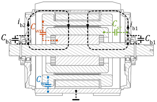 Rapid voltage increase duCM/dt at the neutral point of the stator winding stimulates the occurrence of capacitive couplings in the electrical machine and plays an important role in the mechanism of generating bearing currents. The stator windings of the electric machine are isolated from the stator core, and at the same time, the rotor is practically isolated from other structural elements due to the presence of an oil film in the bearings. As a consequence, a capacitance system is created between the structural elements of the motor, which in the subsequent text are referred to as the internal capacitances of the machine. The electrodes of these internal capacitances are the stator winding, stator and rotor cores, and their dielectrics are, among others, slot insulation, air gap, and oil film in the bearings. In the simplified model of the electric machine, the following capacitances can be distinguished: Cws—capacitance between the stator winding and the grounded stator; Cwr—capacitance between the stator winding and the rotor; Csr—capacitance between the rotor and the grounded stator; Cb1 and Cb2—bearing capacitances on the drive and non-drive end. The spatial location of the above-mentioned capacitances is illustrated in the cross-section of the electric machine in Figure 5. The topology and connection of these capacitances in the form of an equivalent circuit with lumped parameters are shown in Figure 6a [13].