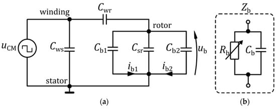 The value of the Cws capacitance depends on the geometrical dimensions of the machine and the configuration of the windings, as well as on the dielectric parameters of the used stator slot insulation, while the value of the capacitance Cwr depends on the shape and dimensions of the electromagnetic circuit. In terms of the electrical circuit, bearings are represented by impedance Zb that consists of a parallel connection of resistance Rb and capacitance Cb (Figure 6b).