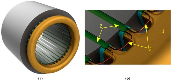 (a) Wound stator with a shielding winding placed in the slot wedges, (b) Fragment of the stator iron core with visible shielding winding connections; 1—stator end-winding, 2—slot wedges, 3—connections of shielding wires placed in wedges.