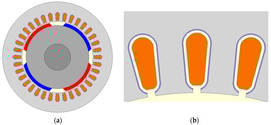 Two-dimensional reference simulation model for determining internal machine capacitances: (a) complete model view, (b) shaping the stator slot and winding.