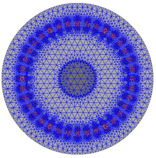 In order to analyze the possibility of introducing design changes to the electric machine aimed at limiting the internal capacitance between the stator winding and the rotor, a two-dimensional model of the machine was developed in the Ansys Maxwell 2D using the finite element method [30]. Simulation tests make it possible to carry out multivariant calculations in order to determine the optimal design of the machine that will be used to prepare the real model. Conducting laboratory tests requires the development and implementation of a number of machine prototypes, which entails considerable costs. In order to determine the internal capacitances of the machine, calculations were carried out in the Electrostatic solver. It should be borne in mind that the adoption of a two-dimensional model of the machine for calculations is associated with neglecting the capacitances between the end winding and the rotor. The field model of the reference design of the surface-mounted PM synchronous machine is shown in Figure 8, and the finite element mesh consisting of 65,900 triangular elements is shown in Figure 9.