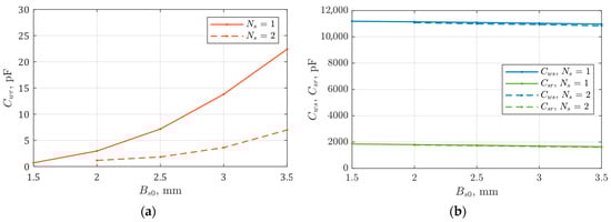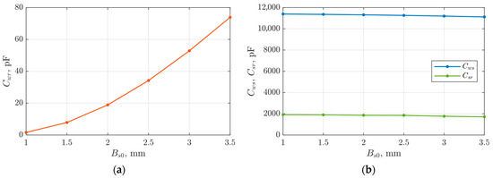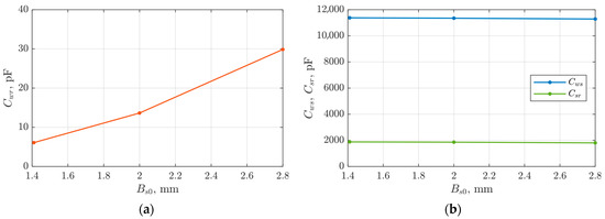 Characteristics of capacitance changes: (a) Cwr, (b) Cws and Csr depending on the slot opening width Bs0.