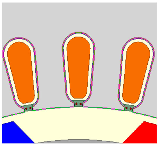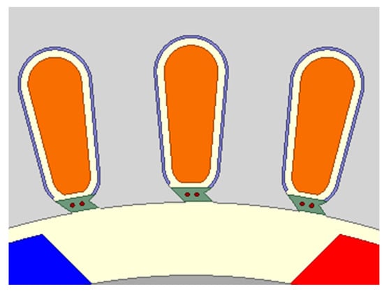 The second analyzed variant was divided into two cases. In the first case, to limit the internal capacitance of the machine between the stator winding and the rotor, a screen in the form of a copper wire placed inside the wedge closing the slot was used. The cases for one Ns = 1 and two shielding wires Ns = 2 (wire diameter was d = 0.4 mm) placed in the wedge were analyzed. The two-wire model is shown in Figure 12. The wires of the shielding winding with the wedge are located in each slot in the stator, and the potential of the wires is connected to the ground.