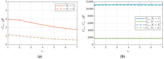 In the second case, the influence of electric permeability on the internal capacitances of the machine was analyzed. The calculations presented in Figure 14a,b show that, compared to the reference model, the Cwr capacitance value decreased by more than six times for the case of a single shielding wire and by about 20 times for the application of two shielding wires inside the wedge. It is also worth noting that the value of the capacitance decreases as the relative permeability of the wedge material increases. For example, it can be mentioned that for the relative permeability of the wedge εr = 5, a reduction in capacitance by another 30% can be observed compared to the permeability of εr = 1. The remaining internal capacitances Cws and Csr for the analyzed electric permeability do not show significant changes.