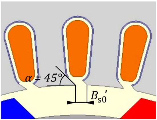 A further modification is introduced by combining together the variants presented in Section 3.2 and Section 3.3. This is a design shown in Figure 17. In this case, both the oblique slot opening and slot wedges with 0.4 mm shielding wires were used. Simulation calculations were performed for different slot opening widths Bs0′ as well as for a different number of shielding wires in the wedge (NS = 1 and NS = 2).