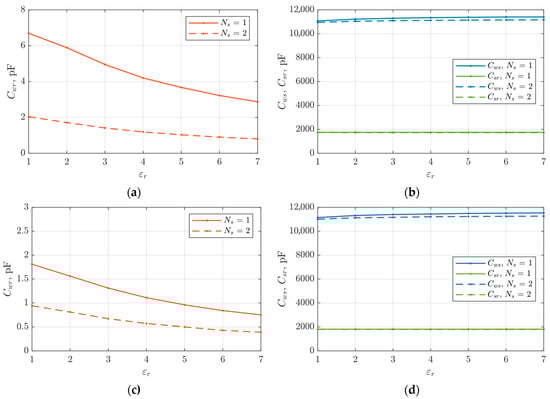 Characteristics of capacitance changes: (a) Cwr (Bs0′ = 2.8 mm), (b) Cws and Csr (Bs0′ = 2.8 mm), (c) Cwr (Bs0′ = 2 mm), (d) Cws and Csr (Bs0′ = 2 mm) depending on the width of the oblique openings of the slots and the electric permeability of the wedges.