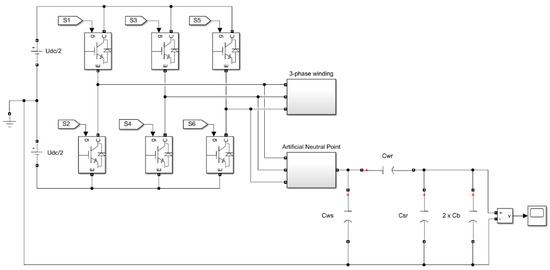 In order to estimate the value of the voltage between the bearing raceways, a circuit model was developed in the Matlab/Simulink environment shown in Figure 19. It consists of three parts: the inverter, the three-phase motor winding, and the internal capacitances of the motor determined by the finite element method.