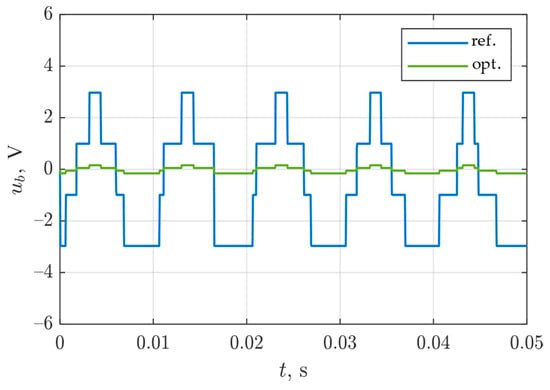 A two-level power electronic converter consisting of six IGBT transistors was considered. The model uses simplified models of transistors [35] available in the Matlab/Simulink environment with the following parameters: Ron = 1 mΩ and Rs = 1 MΩ. The inverter is powered by a DC voltage source UDC, which is split into two parts to form a midpoint. The inverter is powered from a DC voltage source of 565 V, as is the case in the DC-link circuit in standard frequency converters powered from the 3 × 400 V electrical grid. The SVM (space vector modulation) method was used to control the six IGBT transistors. The individual switching states of the transistor keys (S1–S6) of the frequency converter correspond to the space voltage vectors: six active and two zero vectors, presented in Table 1. The output voltage is obtained by the appropriate switching of the active and zero vectors. A three-phase symmetrical stator winding of a permanent magnet synchronous machine was connected to the inverter output, represented by three identical series resistive-inductive circuits. The phases of the stator winding of the machine were star connected. By using three identical resistances, an artificial neutral point was created at the inverter output, to which the circuit of the internal capacitances of the analyzed machine, described in Section 1.2, was connected: Cwr, Cws, Csr, and two bearing capacitances Cb = 100 pF. The circuit model did not take into account, among others, the parameters of the cable connecting the inverter with the motor, as well as the parameters of the earthing conductor. At the output of the voltage divider formed in such a way, a measuring element was placed in order to observe the bearing voltage ub. The waveforms of bearing voltages obtained on the basis of the described circuit model for the reference and optimal solutions are shown in Figure 20.