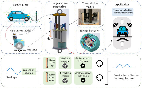In modern vehicles, embedded electronic instruments, such as actuators and sensors, are increasingly used to improve drivability, safety, and ride comfort [1,2,3]. In order to function, these devices require a power source, which is typically provided by batteries. Considering the limited power sources supplied by batteries, scientists are compelled to investigate alternative energy sources for vehicular applications. The possibility of using regenerative braking systems as an alternative to battery limitations has been studied, and they have potential for improving vehicle efficiency [4,5,6]. In addition, vibration energy recovery from suspension has been explored as a means of harvesting energy [7,8,9,10].