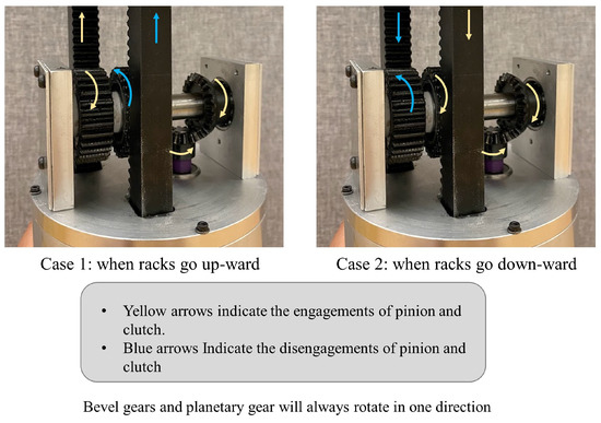 As opposed to the conventional rotational regenerative shock absorber, which frequently alters its direction of rotation responding to the linear movement when fluctuating up and down, a mechanical motion rectifier (MMR) turns the linear movement caused by road irregularities into a unidirectional rotational motion. This causes the piezoelectric harvester to spin continuously in one direction. An up mode and a down mode are the two modes of the MMR main function, as depicted in Figure 1. This occurs with the help of the two key elements, which are two parts of a one-way roller clutch to keep the rotation of the shaft and the piezoelectric scavenger always in the one direction to assure better performance in the energy-conversion process.