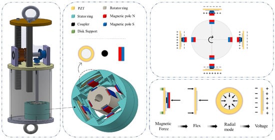 This study investigates the prospect of using piezoelectric transducers to replace the traditional generator commonly used in regenerative shock absorbers for potential energy harvesting. To fulfill this aim, this study uses a shock absorber that is supplemented with a novel magnetically coupled piezoelectric vibration energy harvester (MPVEH) for power generation. The harvester is designed with two noncontact rings to assure no power loss due to friction. It is also built to suit applications that have a rotational mechanism, which in our case is to convert the vibration energy within a vehicle suspension into electricity. With respect to energy conversion technologies, the power density harvested from the piezoelectric transducer is about three times higher than that of the electromagnetic generator. Hence, the proposed scavenger addresses an existing limitation associated with the electromagnetic transducers, such as low power density. The energy scavenger elements are made up of a pair of concentric rings. Four rectangular permanent magnetic plates are symmetrically attached to the inner surface of the stator ring, which is fixed to the lower cap of the cylinder. Between the outer ring and the magnetic plates are piezoelectric patches, and piezoelectric benders are embedded between the stator ring and the magnetic plates. A 3D-printed round plate is placed between the magnetic and the piezoelectric bender as a coupler. There are also magnetic plates attached symmetrically on the external surface of the rotator ring, which is fixed to the long shaft, to create periodic compression due to the repelling magnetic force acting on the piezoelectric benders, which will produce charges that can be extracted. Figure 4 shows a schematic of a magnetically coupled piezoelectric vibration energy harvester (MPVEH) composed of a fixed stator ring and a rotator ring. The outer and inner rings are both equipped with symmetrically placed magnets. The permanent magnetic materials all have identical dimensions, have a rectangular shape, and are symmetrically placed along the circumferential direction. The piezoelectric benders are embedded between the magnet and the outer ring’s inner surface. The piezoelectric benders and the magnets are coupled by round-shaped 3D-printed plates. Additionally, both the inner and outer rings are 3D-printed. As the inner surface of the stator ring is designed with disk support, the piezoelectric material can only be attached by its disk end. Upon transferring the linear motion to rotational motion due to the road vibration, the harvester creates periodic magnetic repelling forces, which then presses the piezoelectric benders. Since the piezoelectric pieces are fixed across the ends of their disks to the disk supports, and due to the presence of the connecting element between the magnet and the piezoelectric, the deformation caused by the magnetic forces are centered in the middle, allowing the piezoelectric disk to flex; hence, a higher voltage can be extracted.