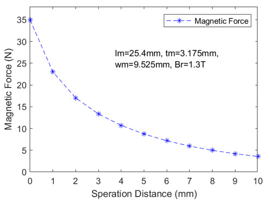 The magnetic force can be calculated with a magnet of parameters given in Table 2. The magnetic force increases significantly at smaller distances between the two magnets, as shown in Figure 6.