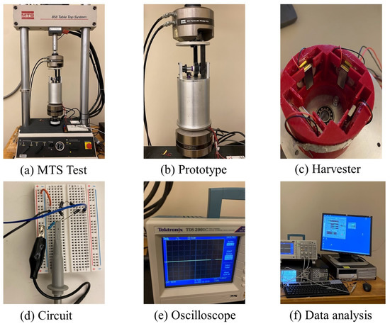 To assess the effectiveness of the proposed design, the harvester was fabricated and an experiment was set up. Figure 7 presents the experimental setup for the bench test of the regenerative suspension system. An 858 table top MTS System was used for the bench tests, as shown in Figure 7a. The prototype of the regenerative suspension system is fabricated for the test, as depicted in Figure 7b. Figure 7c shows the components of the piezoelectric harvester. The parameters of the harvester are listed in Table 2. The harvester is connected to a full-bridge rectifier, and all four piezoelectric benders of the presented vibration energy harvester were connected either in parallel or in series to assess the generated output current and output voltage. Additionally, a variable resistor was used to provide a load and the output voltage across this load was measured using a digital oscilloscope (TDS2001c, Tektronix, Beaverton, OH, USA), as shown in Figure 7d,e. The outer diameter of the rotating ring is 75 mm, and the initial spacing between the magnet fixed to the rotating ring and the magnet attached to the static ring is 3 , unless noted otherwise. The piezoelectric bender disks used in this study (PZT-lead zirconate titanate) are commercially available. The rectangular permanent magnetic plates used are strong Neodymium Magnets (grade N42), supplied by K&J Magnetics, Inc.