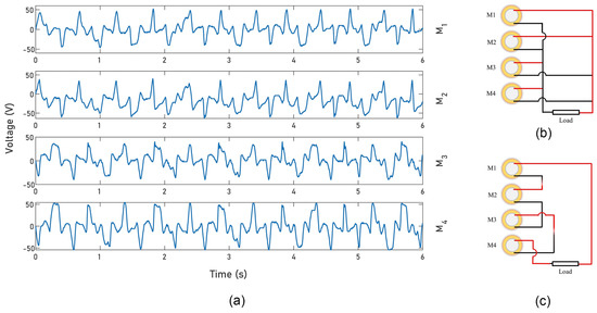 Figure 8a illustrates the output of the open-circuit voltages of all piezoelectric bender disks under the vibration of 9 amplitude at 2.5 . The spacing between the rotating magnet and the static magnet is 3 . We note that the voltage output of M1 and M2 has the opposite performance of the voltage output of M3 and M4, as a result of the difference in the type of force acting, dependent on whether the magnets were in a state of attraction or repulsion. We observe that there are some slight variations with respect to the output amplitude of the voltage among the four piezoelectric bender disks. We hypothesize that the reason behind this is that the spacing between the two magnets is not precisely 3 on each side due to some machining imperfections. In addition, the thickness variation of the adhesive used to attach the piezoelectric disk and the magnet could be another factor that changes the separation distance between the two magnets. Since the piezoelectric benders produce the same or opposite voltage output, this allows the PZT disks to be utilized directly in series or in parallel, thus minimizing circuit processing, as shown in Figure 8b,c. Because a piezoelectric transducer switches polarity based on the effect of magnetic force, the wires of M3 and M4 are always connected reversely. This means that the black wires of M3 and M4 should be connected to the red wires of M1 and M2 in the parallel circuit scenario, as depicted in Figure 8b.