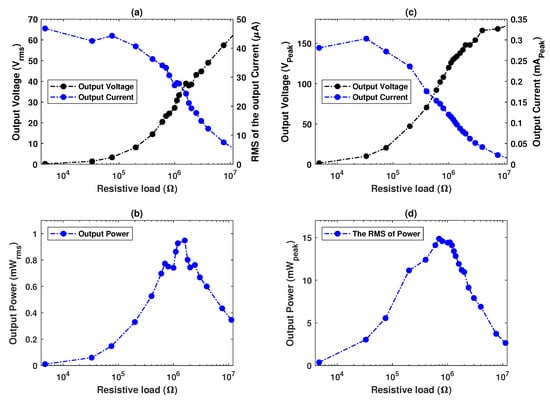 Figure 9a–d demonstrate the influence of the external load resistance on the output peak and the root mean square (RMS) of current, voltage, and power. In Figure 9a,c, the output characteristic is shown in relation to the external load resistance. By incrementally increasing the load resistance from 4.7 to 11.2 , the output RMS and peak voltage show an increasing trend up to 62.2 and 172 , respectively, while the output RMS and peak current show a decreasing trend up to 5.56 and 0.0154 , respectively. The harvested peak power was experimentally determined as ; the RMS of voltage was calculated as , with V being the load voltage across the resistance R; the RMS of current was computed as ; and the average power can be roughly calculated as . The generated power changes with the load resistance and reaches the highest at the matching impedance. When the load resistance increases, both generated average power and peak power increase initially, and thereafter fall. As plotted in Figure 9b,d, as the generated average power and peak power amounted to the highest values of 0.948 and 14.86 , the matching resistances are 1.6 and 800 , respectively. The power is attained at 2.5 and 9 vibration amplitude. The spacing between the two magnets was set to be 3 .