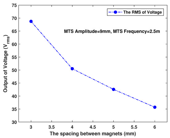 As illustrated in Figure 10, the gap distance between the magnet attached to the static ring and the magnet attached to the rotating ring significantly influences the open-circuit voltage. The test was conducted at 2.5 and 9 vibration amplitude. It is clearly seen that when the spacing between the two PMs decreases, the RMS of voltage increases significantly. The lowest value of the generated RMS voltage is 35.70 , recorded at the largest gap tested between the magnetic plates of 6 . In contrast, the peak value of the output voltage of 68.75 occurs when the gap distance between magnetic plates is as minimum as 3 . However, it should be noted that the smaller the distance between the magnets, the greater the force of attraction and repulsion demonstrated in Figure 6, which can cause the piezoelectric material to collapse. The fracture of the thin ceramic layer of the piezoelectric bender is to be expected the most cause of harvester damage. Furthermore, the piezoelectric disk benders and the magnetic plates are bonded by adhesive (CECCORP C-POXY 5) in this study. Failure of the adhesive is another potential cause of device damage. Collapses were observed only at very narrow distances between the two permanent magnets of the stator and rotating rings that are less than 3 .