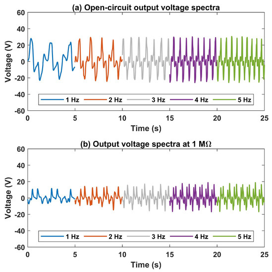 Figure 11a demonstrates the spectra of the open-circuit voltage of the magneto–piezoelectric vibration energy harvester under various road frequencies from the experiment. The results are obtained from a single piezoelectric disk of the piezoelectric harvester. In proportion to the excitation frequencies subjected to the regenerative suspension, as they increase, the harvester rotation speed and magnetic excitation frequencies increase; however, the amplitude of the open-circuit voltage of the piezoelectric harvester, which is approximately 28 V, remains almost unchanged at different excitation frequencies of 1 Hz, 2Hz, 3 Hz, 4 Hz, and 5 Hz. This indicates that the piezoelectric disks are subjected to constant maximum magnetic forces from their excitation magnets which can be determined by the design parameters by adjusting the separation distance between the two magnets, as shown in Figure 6. According to the equation of open-circuit voltage , where d is the piezoelectric coefficient, F is the excitation force, and is the electric capacity of the piezoelectric material, the open-circuit voltage of the piezoelectric harvester is proportional to the excitation force. Thus, the MPVEH can provide relatively stable voltages across wide ranges of frequencies. The rotator ring is equipped with four excitation magnets, which stimulate each of the magnetically coupled piezoelectric disks four times in a single cycle of the rotator ring. Likewise, the load voltage with 1 load resistance was examined over a range of frequencies, as exhibited in Figure 11b. The basis for choosing a 1 resistance value is that it is close to the optimal resistance. As the data reveal, the load voltage rises slightly as the excitation frequency increases. The RMS values of the load voltages are 12.90 , 13.07 , 13.51 , 13.57 , and 13.58 , at the excitation frequencies of 1 , 2 , 3 , 4 , and 5 , respectively. The charge leakage phenomenon is observed under load conditions [44]. Charge leakage is relatively slow at higher excitation frequencies; therefore, the load voltage increases.