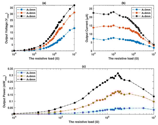 Figure 12a demonstrates the open-circuit output voltage of the vibration energy scavenger with the series-connected piezoelectric bender disks at different vibration amplitudes as a function of external load resistance. The separating distance between the two permanent magnets is set to 5 . Higher vibration amplitude and a greater resistive load tend to increase the output voltage. According to the plot, the highest generated voltage was specified to be around 7 at each vibration amplitude, which is considered to be the highest external electrical load used in the study. Figure 12b shows the closed-circuit output current. In contrast to the tendency of the output voltage, the output current has a propensity to diminish with increasing the external load resistance and to rise as vibration amplitude rises. Figure 12c shows the variation of the generated power acquired from all piezoelectric bender disks embedded in the fabricated suspension at different vibration amplitudes as a function of the external load resistance. A 3 vibration amplitude did not produce a very high average output power, nor did it demonstrate a remarkable peak. However, when the vibration amplitude was increased to 6 , the average output power increased dramatically, and the peak power became relatively notable at a particular optimum resistance. Whereas an outstanding peak was observed, as well as an increase in the output power at a 9 vibration amplitude. Both the 6 and 9 vibration amplitude share the same optimal resistive load of 1.6 , at which the peak output power was 0.177 and 0.315 , respectively.