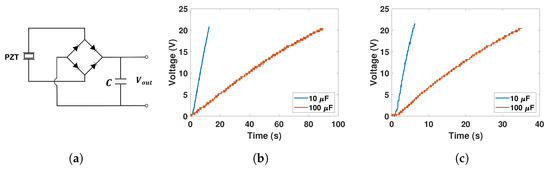 As piezoelectric scavengers cannot be employed as standalone devices in most external sensors and in similar applications, it is necessary to rectify and store their outputs in order to be useful. A rectifying circuit is joined between the piezoelectric vibration energy harvester and the energy storage so that the generated voltage signals can be converted from AC to DC. Figure 13a shows the full-wave bridge rectifier that is used to maximize the energy conversion efficiency. Figure 13b,c show capacitor charging responses of the piezoelectric energy harvester of different capacitors under a vibration of 6 amplitude at 2.5 , connected in series and in parallel, respectively. It is observed that both in series and in parallel connections, 10 capacitors charge more rapidly than 100 capacitors. At the parallel connection, the piezoelectric harvester can charge a capacitor that has a rated voltage of 50 and a charging full capacity of 100 from 1 to 20 fast in 31 , which is hopeful to supply power for vehicle embedded electronic devices. In conjunction with appropriate capacitors, this can supply real-time power to small electronic devices. Through the capacitor, the device can be supplied with power directly, as well as storing surplus power.